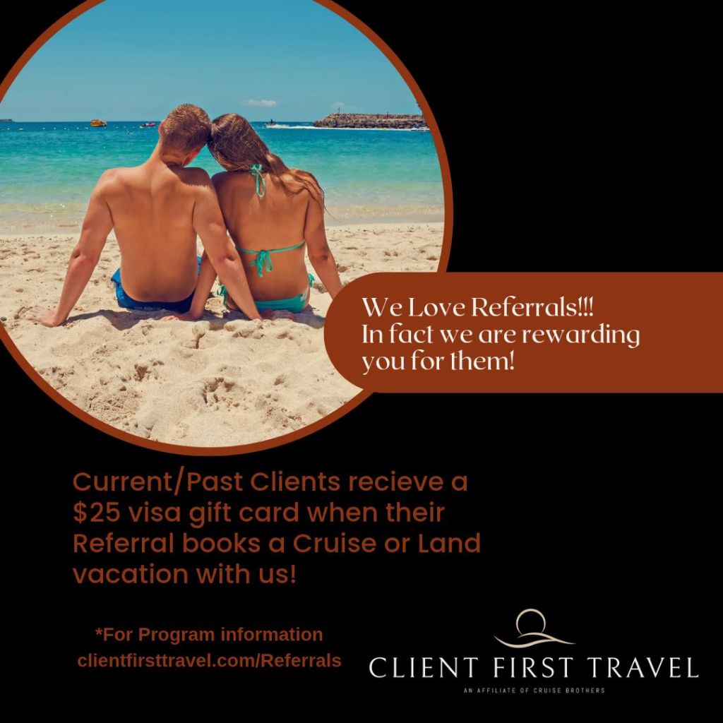 To qualify for the referral reward, the referring client must have booked a confirmed Land or Cruise vacation with Client First or Adam If By Sea Travel in the past 12 months.